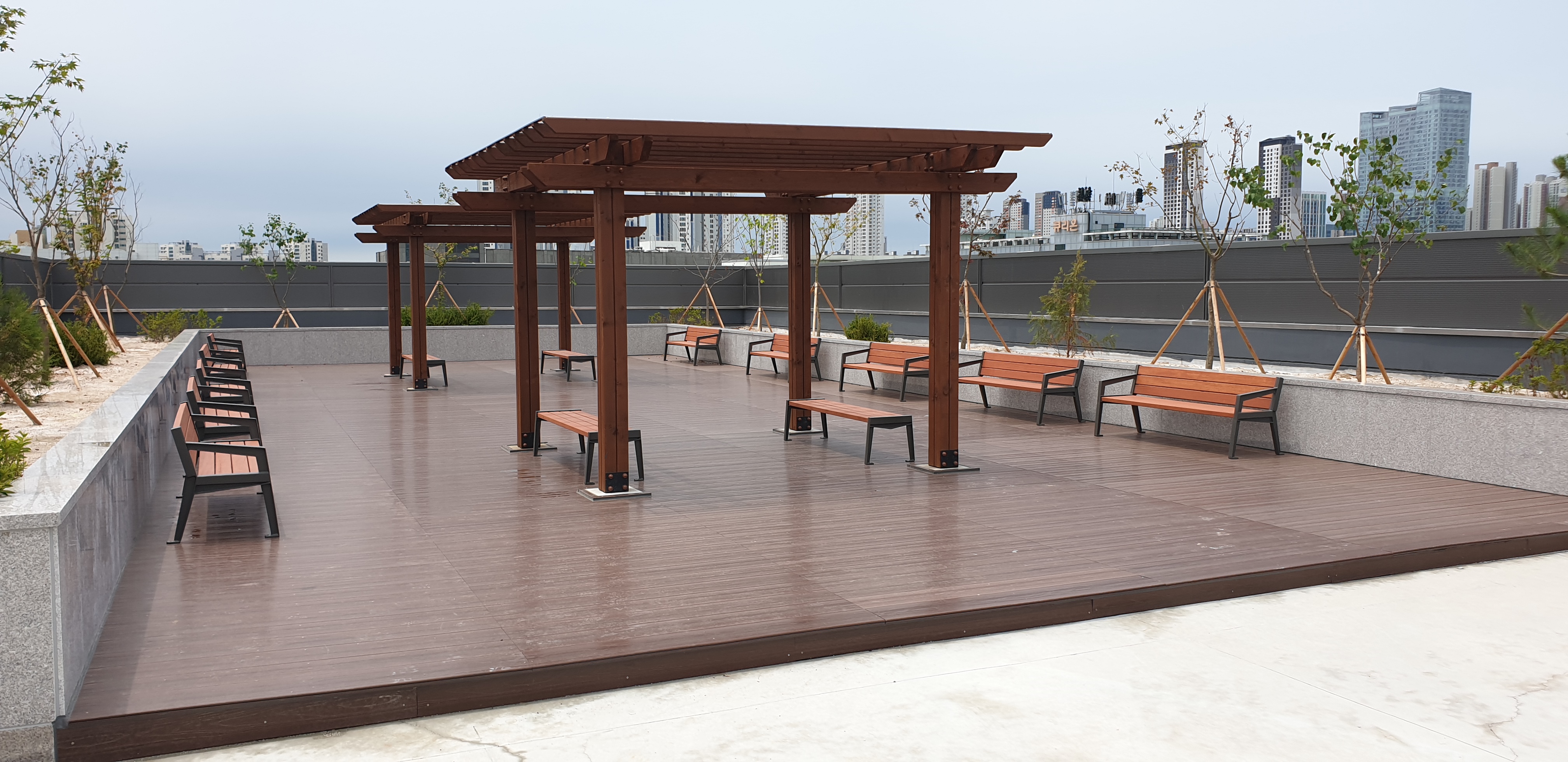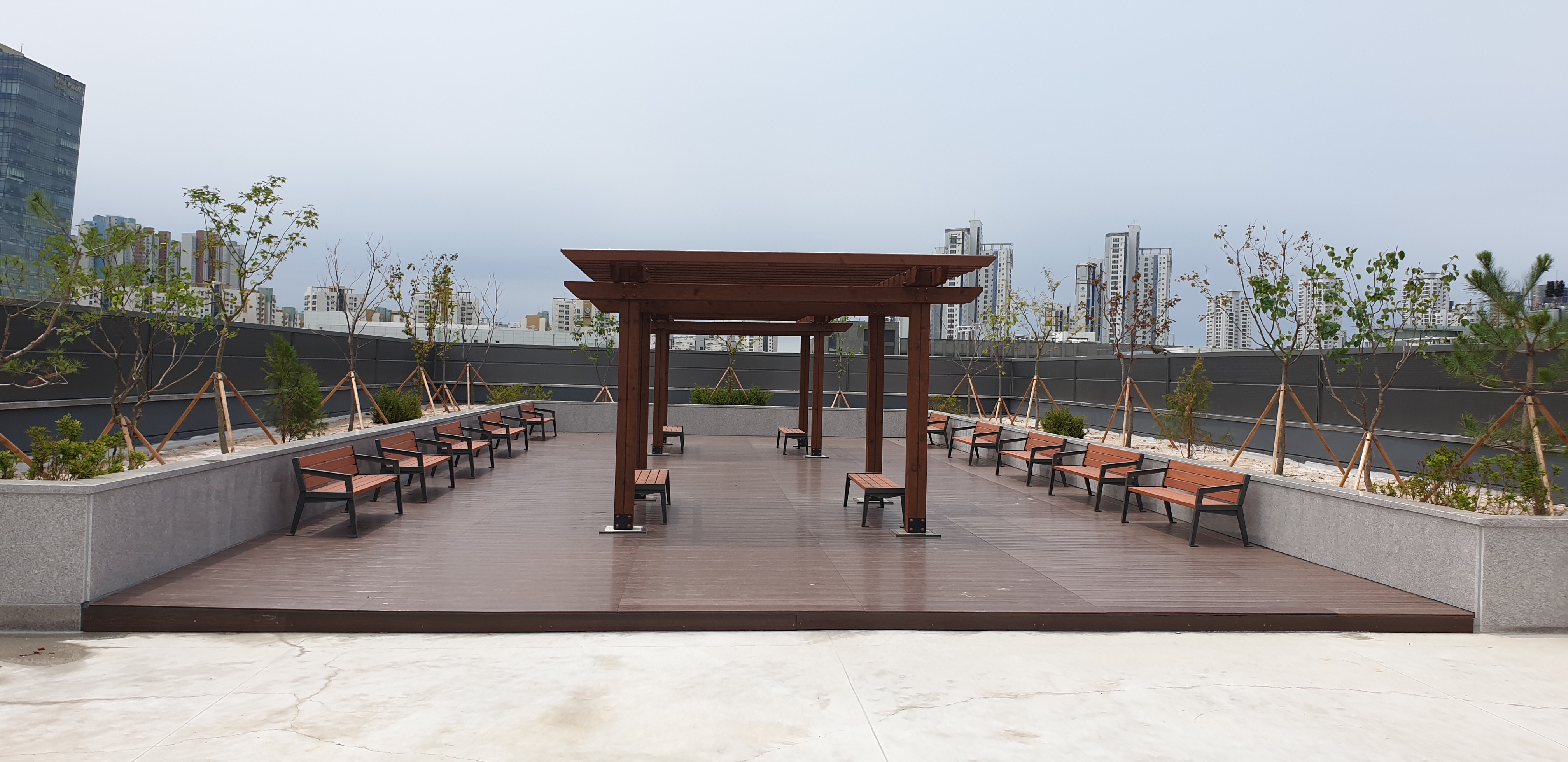 신축건물옥상입니다.넓은 면적에 휴게실을 데크로 꾸미니깐 시원하고 좋으네요