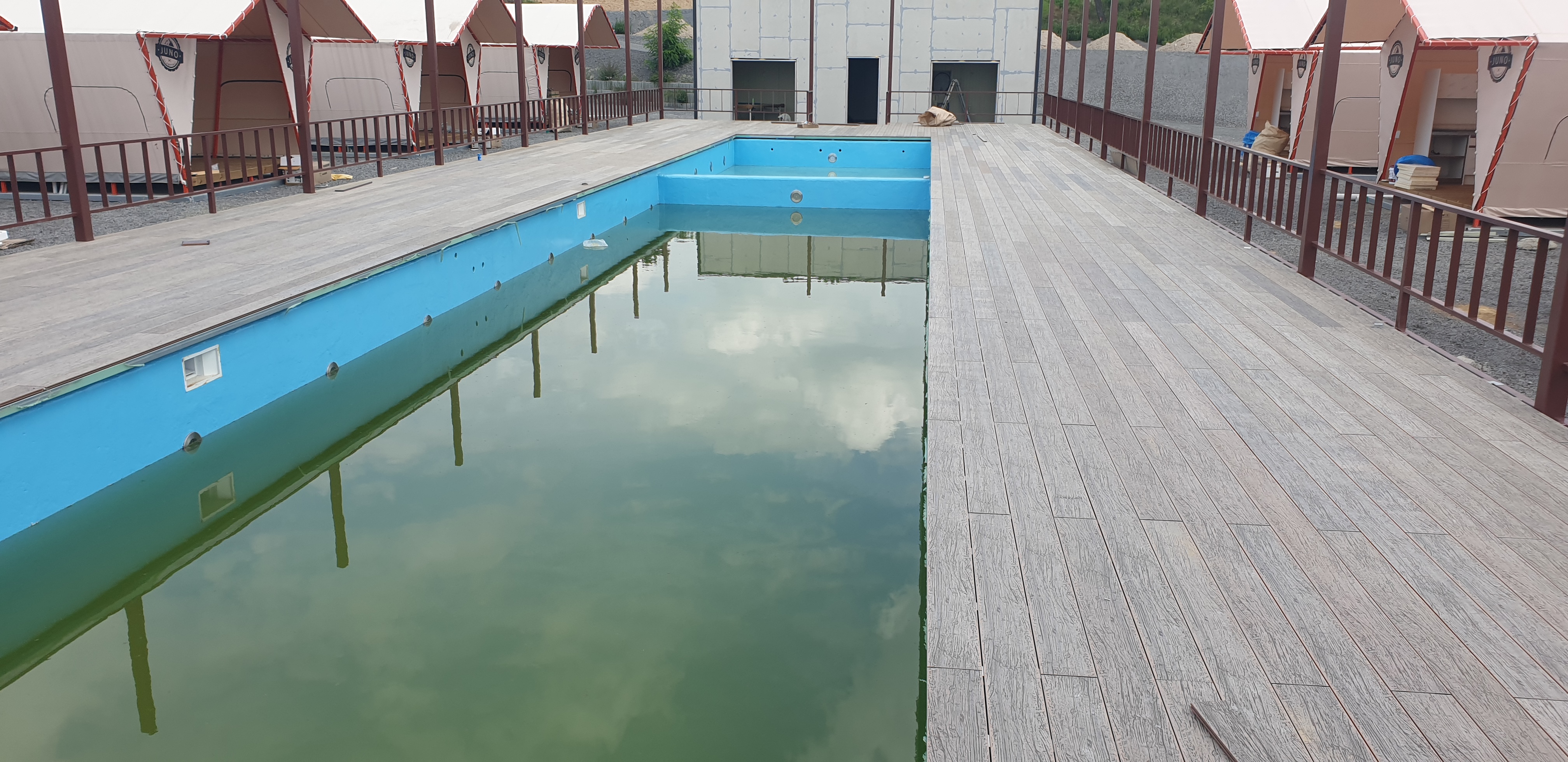 오늘은 캠핑장과 실외수영장에 함께 만들어진 곳에 논슬립합성데크가 시공된 모습을 보여드리겠습니다.