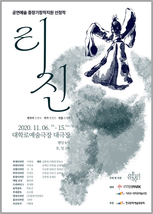 [연극: 리진] 극단:유목민 11월 6일(금)대학로예술극장 대극장3층 오후 8시 공연 [공연내용] 콜랭. 강연. 홍종우. 모파상까지 리진은 그들과의 관계를 통해 좀 더 넓은 세상으로 나아가지만 결정적인 순간 그들은 보호막이 되어주지 못하고, 무대로 소환해 낸 리진의 사랑은 어미와도 같은 명성황후로부터 시작되었듯이, 그녀의 죽음과 함께 비로소 자유로워진다. 조선의 무희에서 파리의 연인으로, 나혜석과 윤심덕보다 한 세대를 앞서 대한제국 최초의 근대여성으로 살다간 리진. 본극을 통해 서구열강의 침탈에 신음하는 조선 땅, 상실의 시대를 가열하게 살다간 예인의 삶을 조명해 보고자 한다. [시놉시스] 춤을 출 때는 ‘서여령’으로, 자수를 놓을 때는 ‘서나인’으로, 동무 소아에게는 ‘진진’으로, 강연에게는 ‘은방울’로 불렸던 리진. 어린 시절 천주교 박해로 부모를 잃고 서씨의 품에서 자란 리진은 블랭 주교에게 프랑스어를 배우게 되며 그가 데려 온 부랑아 소백(강연)과 함께 살면서 가족의 따스함을 느끼게 된다. 5살 무렵 리진은 우연히 서상궁을 따라 궁에 놀러갔다가 명성황후와 만나게 되고, 죽은 자식 생각에 유독 영민해 보이는 아이(리진)를 어여삐 여기게 된 왕비의 총애를 받으며 조선 최고의 궁중 무희로 성장한다. 1886년, 법국(프랑스) 초대 공사로 부임한 조선이라는 동양의 작은 나라에서 우연히 마주친 한 궁녀의 아름다움에 반한 콜랭. 그가 자신도 모르게 프랑스어로 인사하자 놀랍게도 그녀는 유창한 프랑스어로 인사를 받는다. 순간 불같은 사랑을 느끼게 된 콜랭은 관례를 치른 궁녀를 프랑스로 데려가기 위해 차관유치를 조건 삼아 왕부부의 허락을 구하고, 그녀에 대한 남편의 관심을 두려워하던 명성황후가 윤허를 서두르자 고종도 '리진'이라는 이름까지 하사하며 출궁을 허하게 된다. 자유에 대한 갈망과 콜랭을 통해 전략적으로나마 조선에 도움을 주기 위해 어린 시절부터 좋아했던 강연과 정신적인 지주인 왕비, 은인 서씨 등을 뒤로 한 채 2달간의 긴 여행 끝에 프랑스에 도착한 리진은 프랑스 사교계에 성공적으로 안착하는데, 이때 조선에서부터 안면이 있던 홍종우를 만나게 된다. 춘향전 등을 같이 번역하자고 접근하는 홍종우가 자신을 사모한다는 것을 알게 된 리진은 그를 경계하고, 유일하게 마음이 통했던 모파상마저 죽자 차츰 이국 생활에 회의를 느끼게 된다. 조선을 떠나기 전 프랑스에 가면 결혼을 하겠다는 콜랭 또한 약속을 지키지 않고 급기야 계속되는 유산과 이방인으로서 감내해야 하는 질시 등으로 몽유병에 걸리게 되는 리진. 결국 콜랭은 리진을 위해 조선으로 함께 돌아오지만 홍종우의 흉계로 그녀의 곁을 떠나게 되고 강연도 손가락이 잘리게 된다. 프랑스에서 입던 드레스를 조선에서도 그대로 입는 리진. 결국 그녀는 명성황후 시해사건을 직접 목격한 충격으로 어린 시절 블랭 주교에게 선물로 받았던 불한사전에 독을 발라 먹고 스스로 생을 마감한다. 프랑스로 떠나게 된 것도 어린 리진에게 배를 긁어 먹여주던 어미 같은 황후의 뜻이었고, 그곳에 뿌리 내리지 못하고 돌아오게 된 것도 그녀에 대한 그리움이었기에 황후가 없는 궁궐은 무의미하기 때문이다.