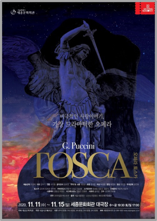 [오페라 토스카] 서울시 오페라단 세종문화회관 [공연내용] 푸치니 오페라 토스카 극적인 사랑과 극적인 결말의 베리즈모 오페라 19세기, 나폴레옹과 카톨릭 왕정에 의해 뺏고 뺏기는 로마의 긴박한 정치적 상황. 한 여인을 사이에 두고 두 남자의 증오가 매개체가 되어 결국 죽음에 이른다. 우정과 사랑 사이에 선 한 남자의 번민, 의심, 속임수… 음악은 스토리와 함께 차차 가속도를 내어 마침내 토스카가 성벽 아래로 몸을 던지는 순간, 오페라는 무너지듯 막을 내린다. [시놉시스] 감옥에서 탈출한 국사범 안젤로티가 성당에 숨어들었다가, 우연히 화가 카바라돗시를 만나 도움을 받게 된다. 카바라돗시의 연인 토스카는 평소에 그녀를 사모하던 스카르피아의 계략에 속아 카바라돗시가 변심했다고 생각한다. 이후 죄수를 숨긴 죄로 카바라돗시를 체포한 스카르피아는 토스카가 있는 곳에서 그를 고문한다. 아무 말 하지말라는 카바라돗시의 부탁이 있었지만, 그의 고통스런 신음 소리를 견디지 못한 토스카는 안젤로티의 행방을 말해버린다. 발각된 안젤로티는 자살하고, 이제 카바라돗시를 죽이려는 스카르피아에게 토스카는 할 수 없이 애정을 허락하고 카바라돗시를 놓아주기를 거래한다. 이에 스카르피아는 카바라돗시를 거짓 총살하라고 명한다. 토스카는 카바라돗시와 외국으로 가기 위한 출국 허가서를 스카르피아에게 요구하고, 이내 책상 위에 있는 칼을 몰래 집어 다가오는 스카르피아를 찔러 죽인다. 허가서를 손에 쥔 토스카는 카바라돗시에게 자신이 스카르피아를 죽인 것과 거짓 사형에 대해 얘기하고, 죽는 연기를 조언하며 기뻐한다. 병사들이 나타나 총을 쏘고 퇴장하자 토스카는 쓰러진 카바라돗시 곁에 다가가지만 그는 진짜 죽어있다. 곧이어 스카르피아를 살해한 그녀를 잡기 위해 경찰들이 몰려들자 토스카는 흉벽에서 뛰어내려 자살하고 만다.