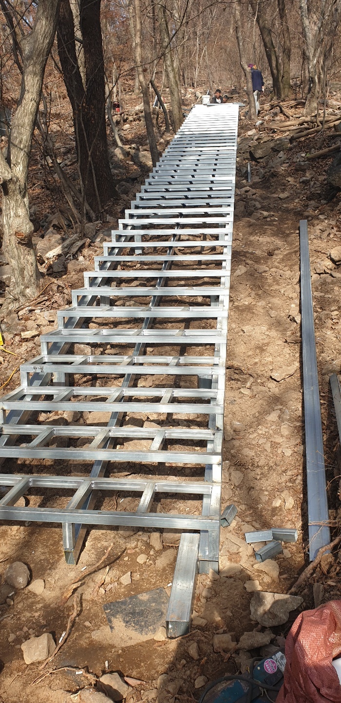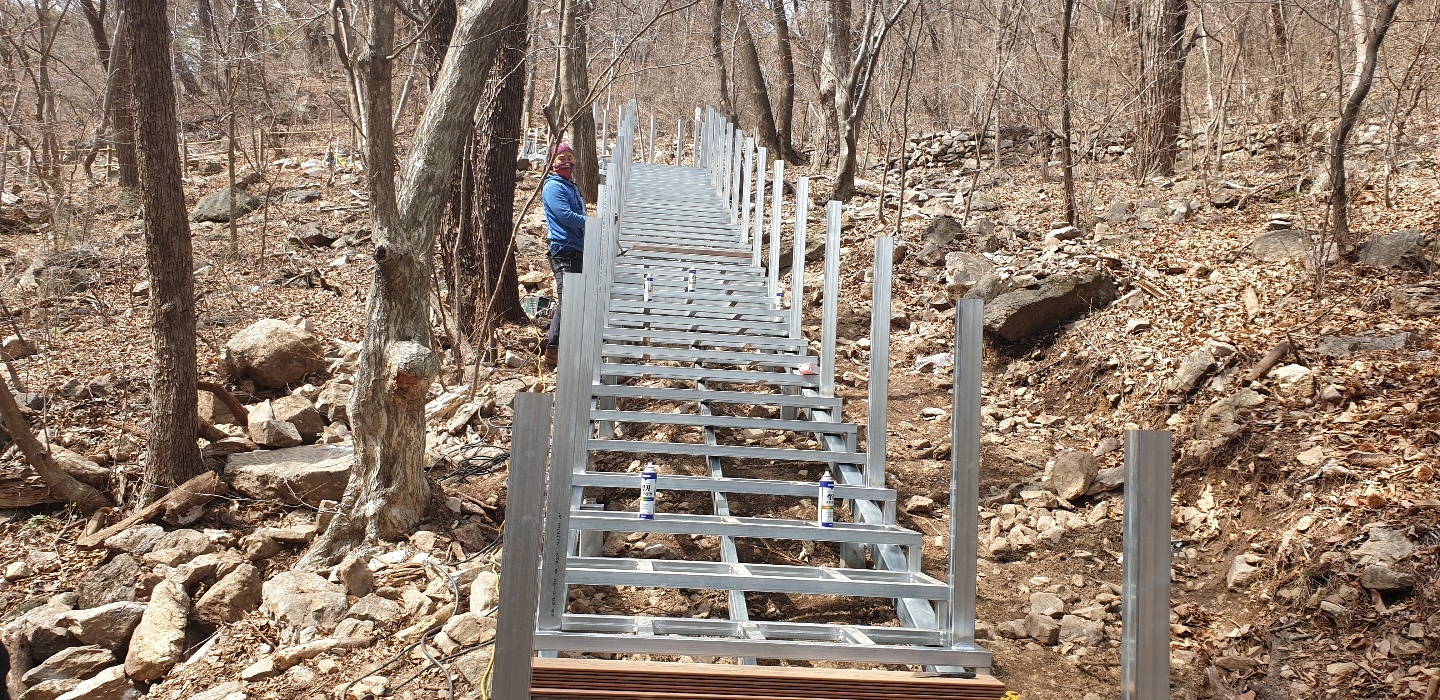 계단도 상하로 안전하게 보행할 수 있도록 넉넉한 폭을 만들어 주고 혹시나 모를 사고를 위해 양 옆으로 핸드레일을 시공했습니다. 등산하다 보면 생각지도 못한 변수에서 사고가 날 수 있다는 점을 감안한 꼭 필요한 도구라고 할 수 있습니다.