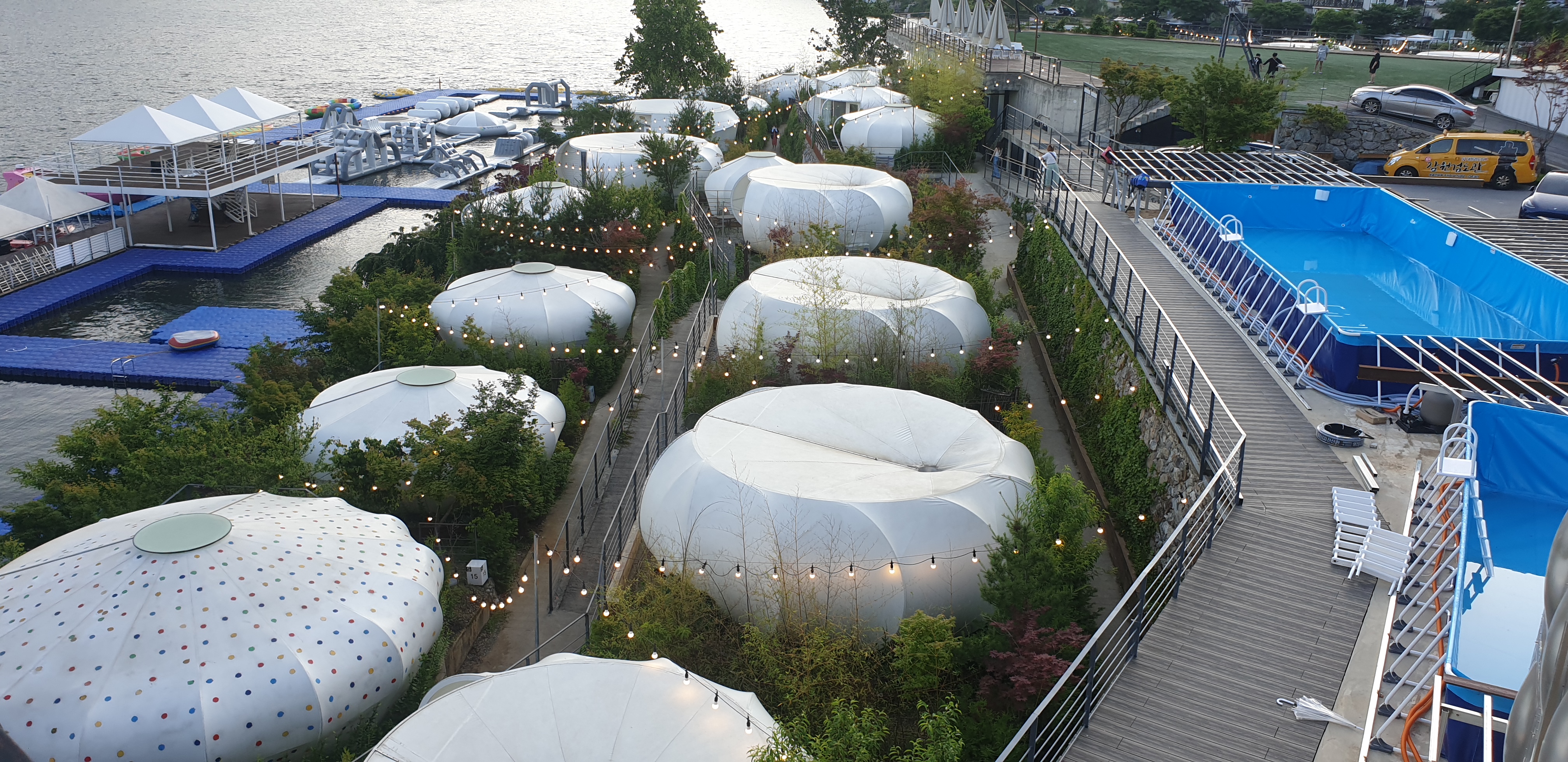 20여개 물놀이 시설과 보트,수상스키, 제트스키등 바다에서 놀기 어려운 기구들을 한곳에 모아둔 곳 같네요. 또한 숙박시설도 생각외로 특이하면서 깔끔한 외관을 볼 수 있습니다.