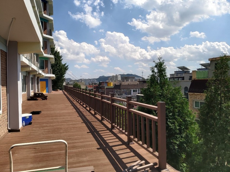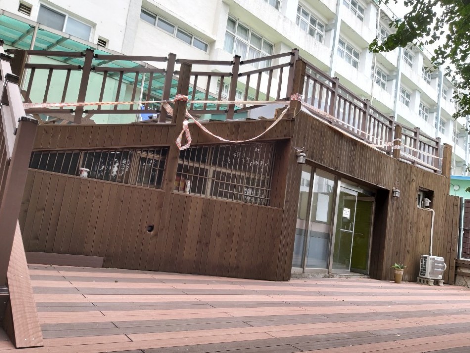 합성목재데크와 합성목재데크를 함께 시공하는데 깔끔한 공간에서 학생들이