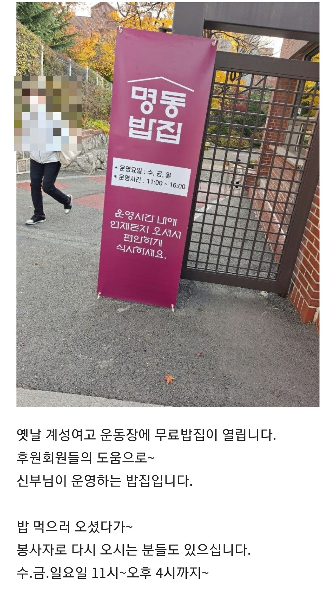 서울 명동성당 한쪽에서 생계가 어려운 분들께 작지만 밥 한끼라도 따뜻하게 드시도록 운영하고 있습니다.