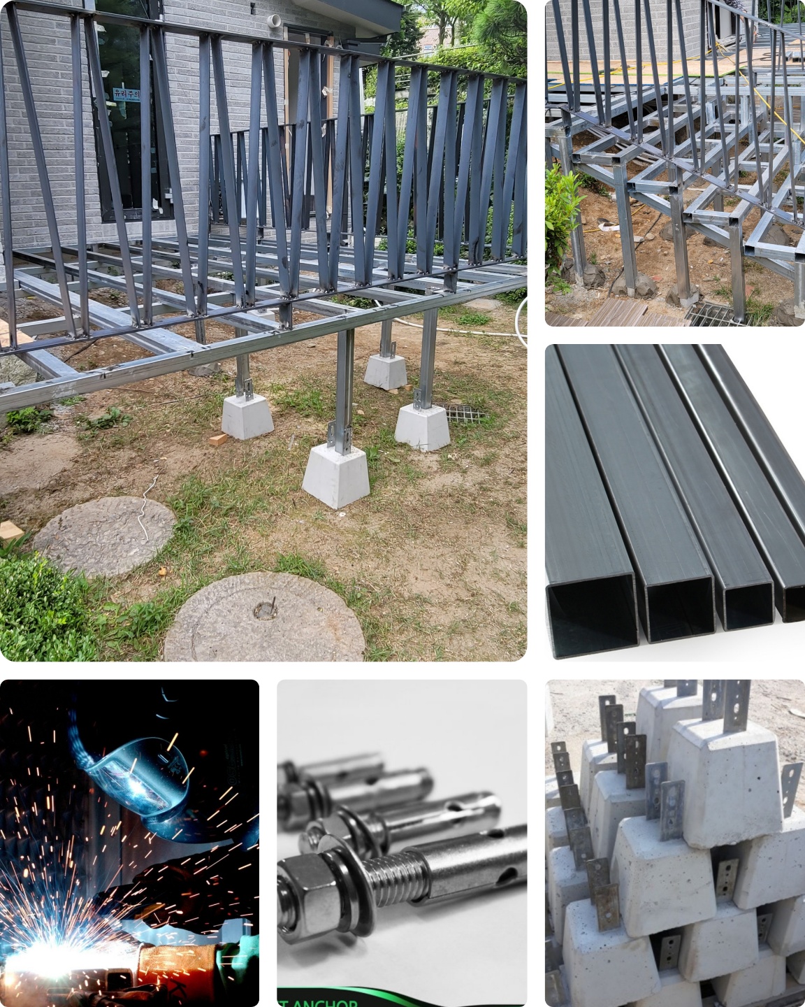 흙바닥일경우는 우선 기초석이 필요하고 콘크리트 바닥일경우에는 바닥에 고정할 앵커볼트와 엘보가 필요하고, 옥상일 경우는 바닥에 앵커볼트를 사용못하니 본드나 접착제 같은 자재가 필요합니다.