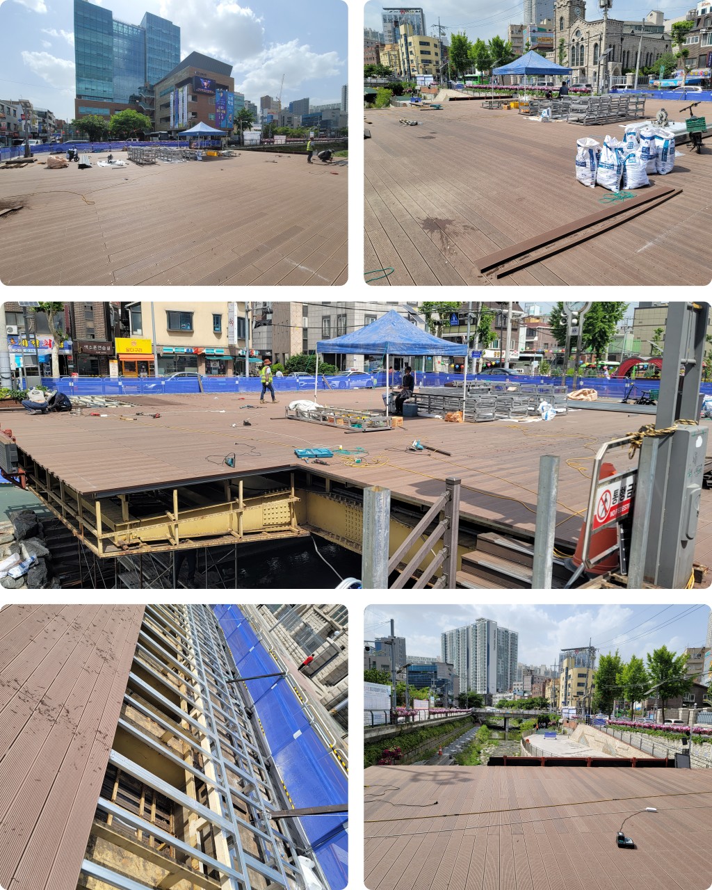 사진을 보면 기존 성북천에 있던 목재데크로 시공한 광장을 합성목재데크로 변경했습니다.