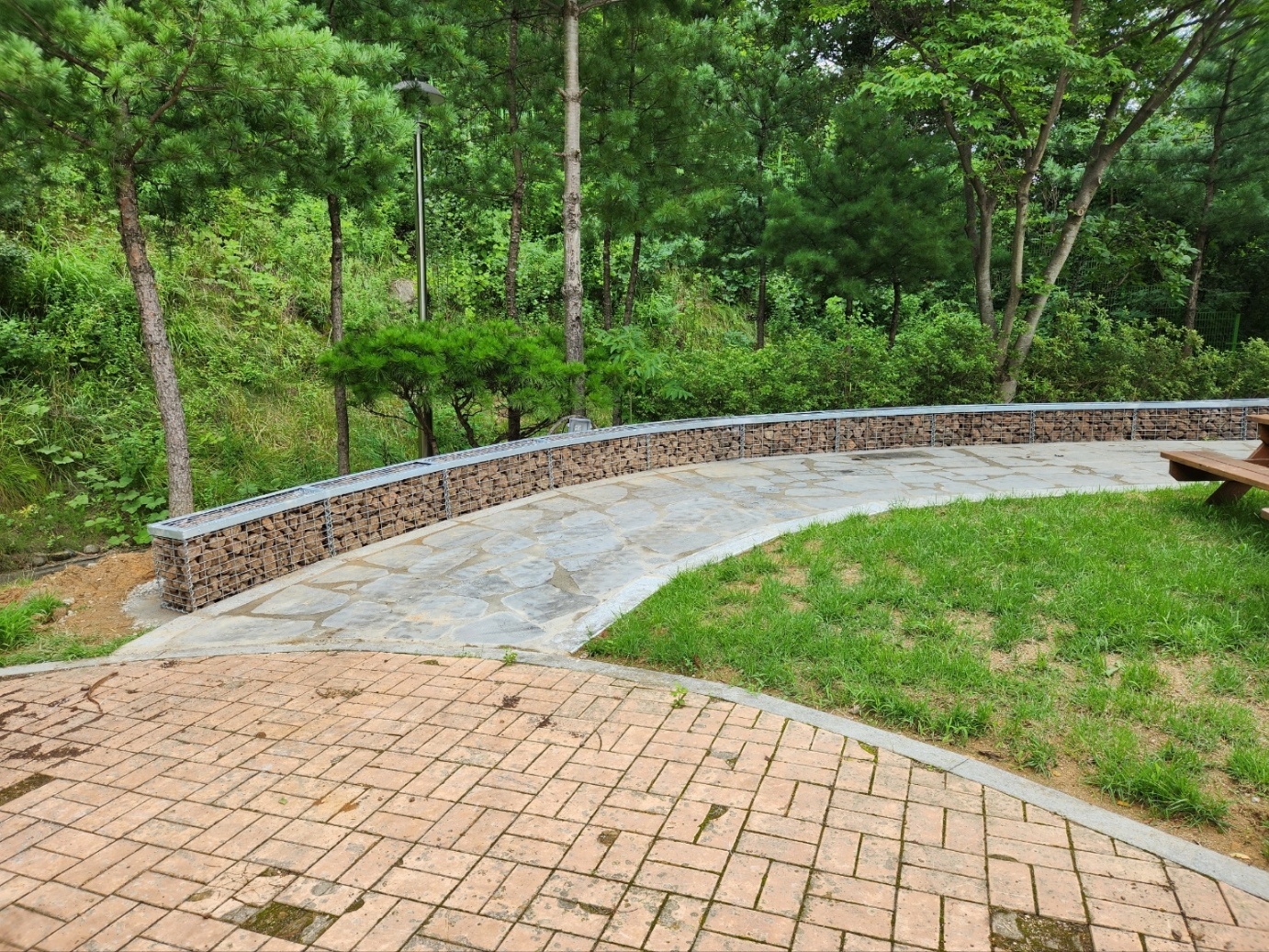 개비온 돌망태는 저희 회사에서 시공한 사례이고 호피석 합성목재데크 벤치는 아파트 인근에 시공된 사례를 촬영했습니다.