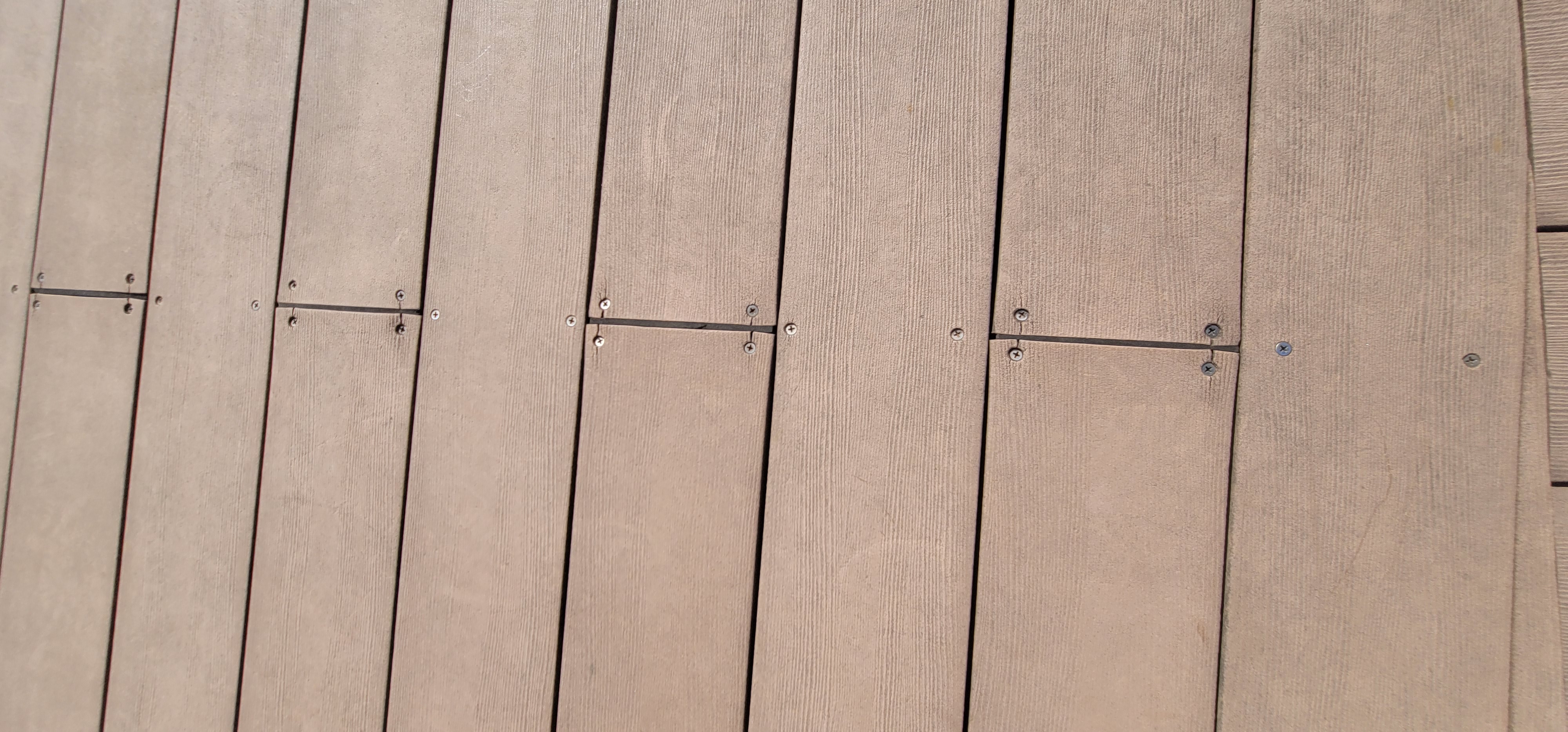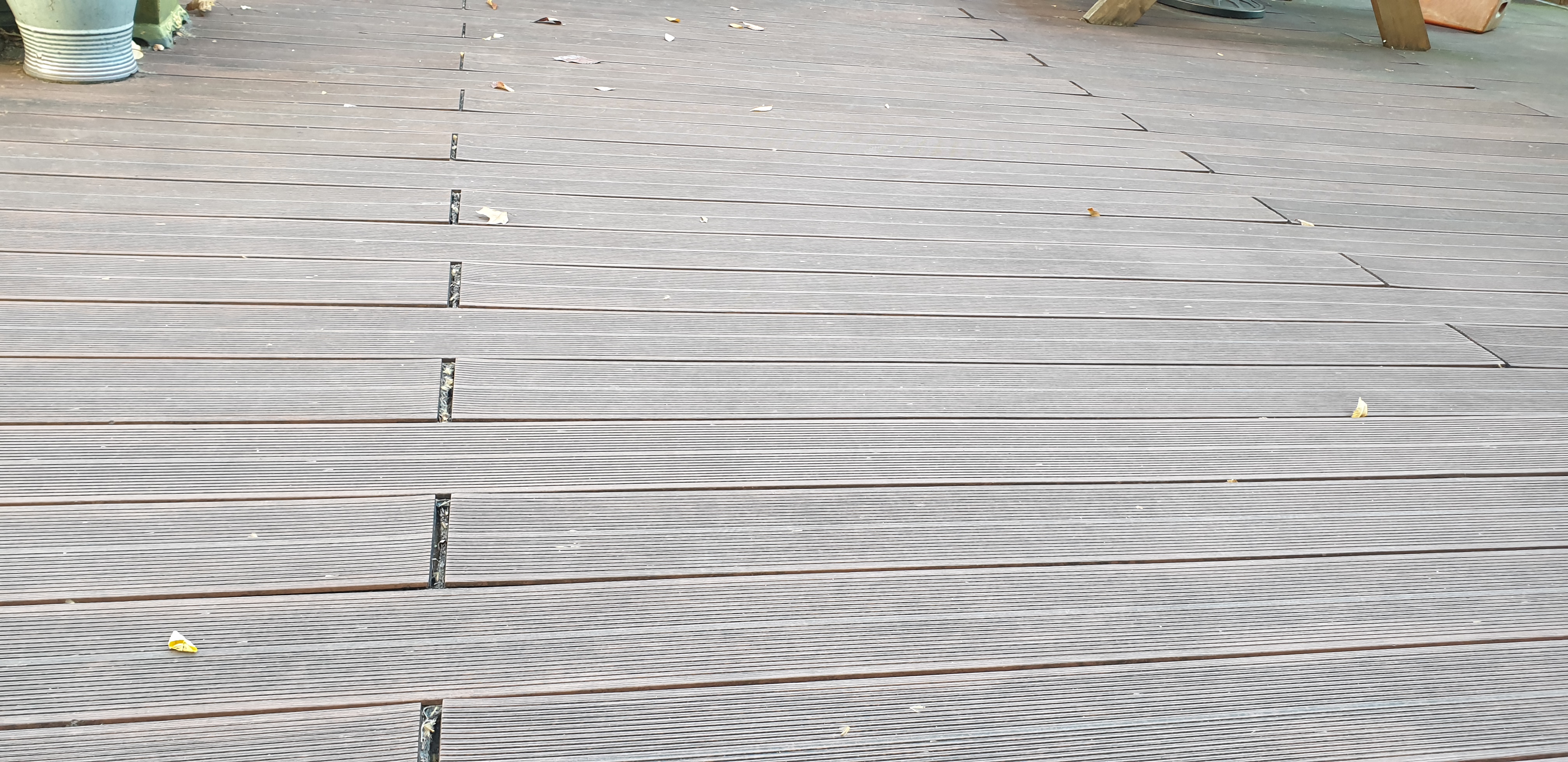 데크의 경우 간격이 벌어지거나 피스주변이 금이가는 현상, 데크가 휘거나 으스러지는 현상이 많이 생깁니다.